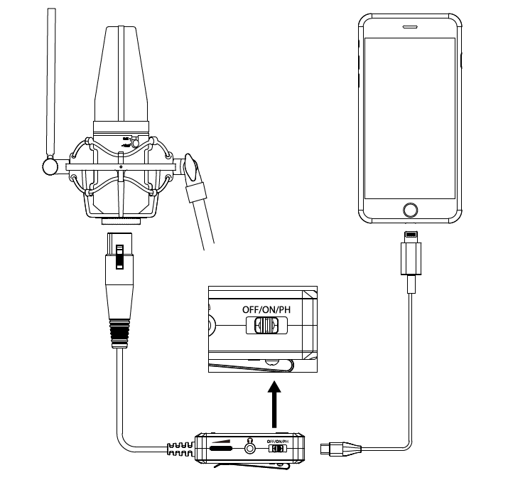 1、当BY-BCA70的XLR插头连接的麦克风为无源麦克风时,此时需要将BY-BCA70的开关拨至"PH"(幻象电源)位置,此时电源指示灯将亮绿色。